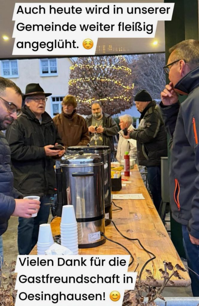 Am 16. Dezember 2024 kamen die OeSinger, wie auch im Jahr davor, sehr gerne der Bitte zur Teilnahme am „lebendigen Adventkalender“ der Gemeinde Engelskirchen nach und luden zu Gesang und Getränken in der Chorstube auf dem Dorfplatz ein.
